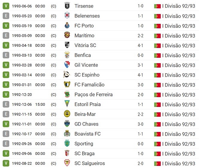 Not one of the Big Three won there, with Benfica and Sporting held to goalless draws and future league champions FC Porto beaten by a single Hugo goal, a brilliant header following a Djukic cross that left Vitor Baía hapless. The match was played in mid-May and was extremely tense with several fouls bordering on violence, with staff members of each club almost coming to blows at half time. It was actually a fixture that should have been played in week 26 but had been postponed. The unexpected win put Farense right into contention for that final European spot, but a defeat in the penultimate day of the season at Paços de Ferreira cut short their dreams.