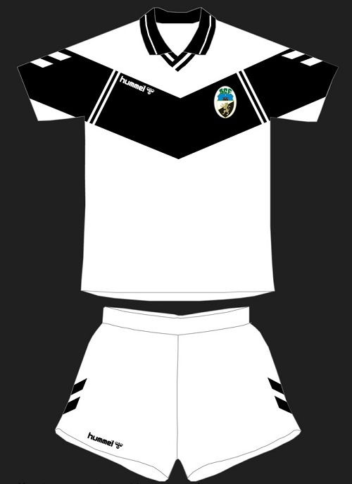 The club had left Adidas to join with the German company Hummel for the 1992/93 season, and the brand, which was already famous for its radical and innovative templates, came up with one of the most iconic shirts the club ever wore. A huge inverted black triangle covered the chest of a mainly white kit and shirts, with black socks to go along with it. The neck was also black, as was part of the shoulders, with the sponsorship of Fontes Romanas printed in blue and white inside the triangle. The club crest was sewn in a circular fashion above the sponsorship and alongside the sports brand logo.