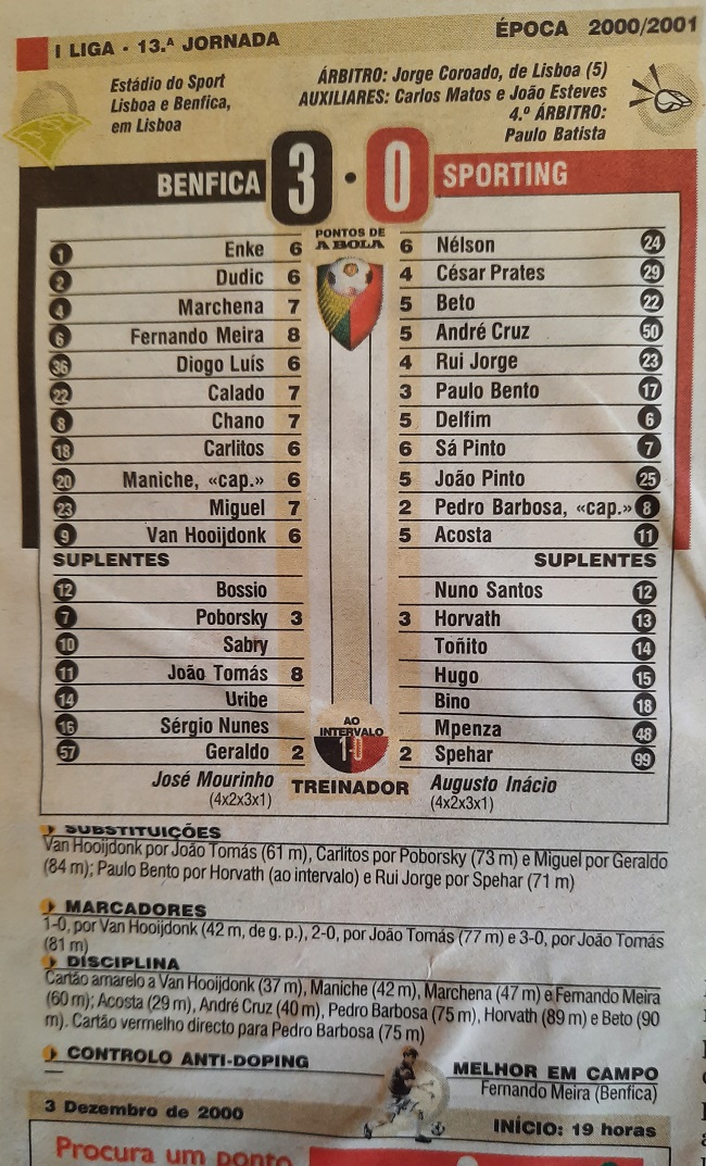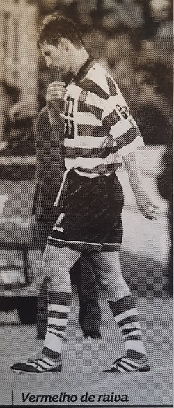 Mourinho, sensing that something was brewing, decided to take off van Hooijdonk and replace him with João Tomás, instructing the young striker to hold onto long balls and take every opportunity he got on the counter. Fifteen minutes later, an already incensed Pedro Barbosa, tired of being kicked out of the game, confronted Coroado and received a double yellow card in a matter of seconds, thus being sent off. Inácio had no possibility of adjusting things from the bench, since he had sent Horvath on at half-time for Paulo Bento and only a few minutes earlier had replaced left-back Rui Jorge with forward Robert Spehar.