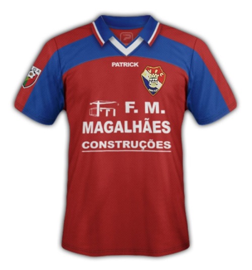 For the first kit main shirt, the all-red was replaced by a horizontal blue strip that stretched from the arms and shoulders up to the collar, which was then drawn in white, to represent the three main colours of the club’s badge. The company logo, in white, was placed centrally instead of on the right-hand side of the chest, and sponsorship of the local construction company F.M. Magalhães was given a full central position that dominated much of the shirt, in white. The shorts were also red with blue stripes on them, the same as the socks, even if they used their blue ones on occasion, such as when they travelled to play Boavista, Sporting or Belenenses away.