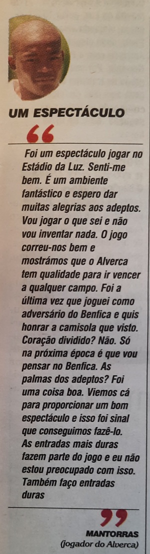 By then, Benfica were already lagging behind in the title race, which looked like a duel exclusively between FC Porto and Boavista, and Toni would be working with a squad that did not fit his style of play in the slightest. The first match in charge was an uncomfortable trip to Alverca. Luís Filipe Vieira, the Alverca president, had been a backer of Vilarinho all along and was promised a role as sporting director at Benfica for the upcoming season. He had also vowed to bring with him the young Pedro Mantorras, an Angolan striker he had taken under his wing at Alverca, so supporters from rival clubs expected nothing but an easy win on Toni’s debut. They were in for a surprise.