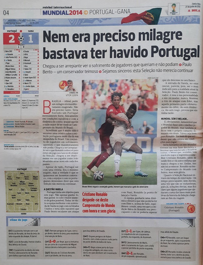 Three more goals were still needed, but hope was alive again. Ronaldo did his utmost, sending in four efforts on goal in the following minutes, all denied by the Ghanaian goalkeeper in style. Varela also missed a good opportunity and, come the 89th minute, Bento decided it was all decided and replaced Beto for Eduardo – after sending on Vieirinha and Varela for Pereira and Eder – to give the goalkeeper a chance to experience playing in a World Cup. It was as if he raised a white flag, a message that destroyed the players’ morale for a rampaging finish that never came.