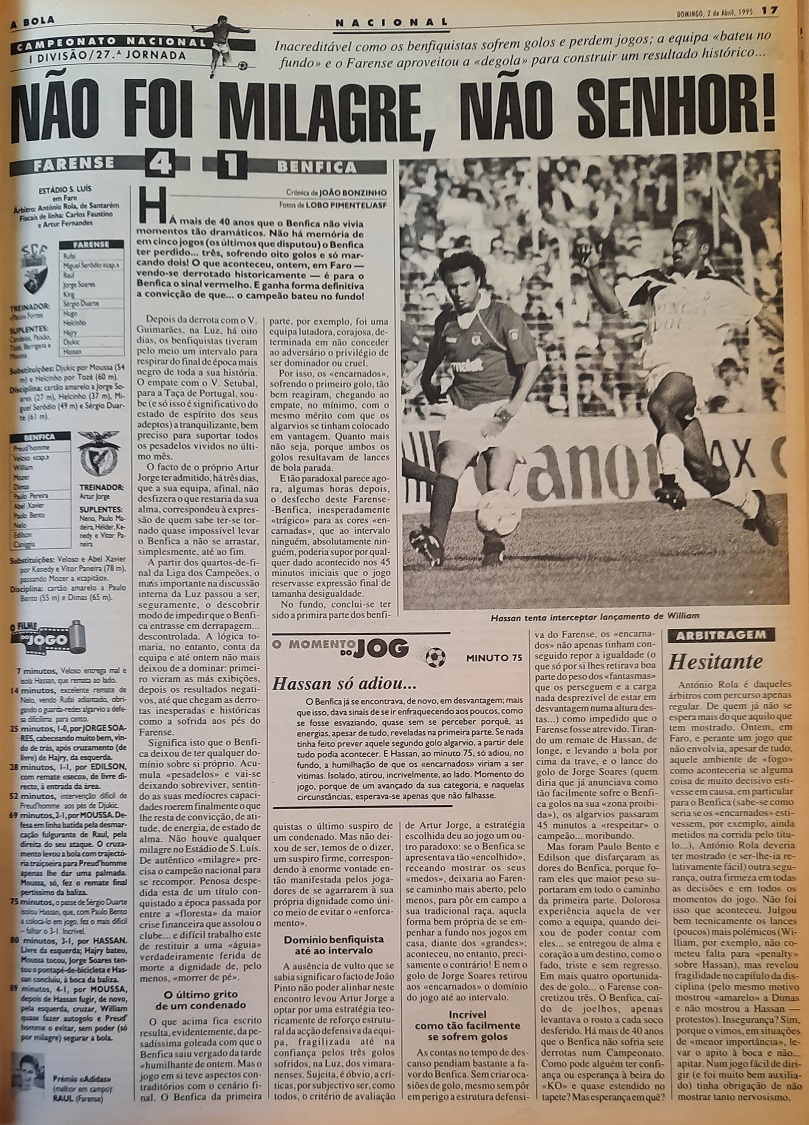 Match report in A Bola on 2 April 1995, the day after Farense had thrashed Benfica