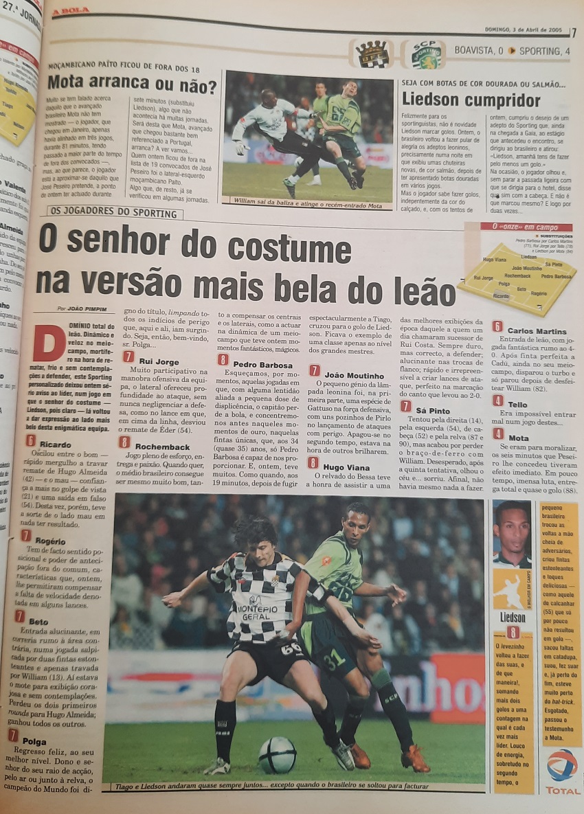 The match was played on 2 April, with a late Saturday kick-off. The stadium fell still for a minute’s silence in memory of Pope John Paul II who had been declared dead hours before, in Rome. Peseiro called up his usual starting eleven, with Ricardo – the former Boavista star – in goal, with Beto, Polga, Rui Jorge and Rogério playing from the back, while Pedro Barbosa, Hugo Viana, Fábio Rochemback and a teenage João Moutinho supported the attacking partnership of Sá Pinto and Liedson, the Brazilian by now a certainty of goals aplenty having settled in the league.