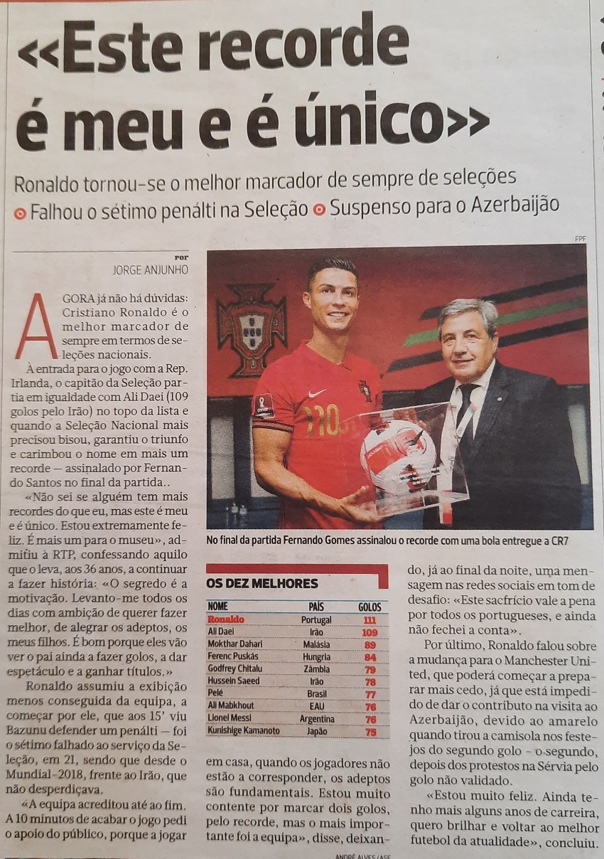 The Madeiran phenomenon had finally risen to the top of the list of all-time international goalscorers, his two goals taking his tally to 111 to overtake Iranian striker Ali Daei as the top scorer of all time.