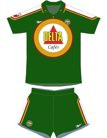 Reebok clearly wanted to create a model that mixed the club’s new identity with its sole sponsor. The brand opted for an all-round green shirt and shorts, but placed in the middle the huge sponsor of Delta Cafés, with their famous triangle, inside a red, yellow and white circle, the same colours that could be found on the new crest. The “Galgomania”, as it was called then by the sporting press, brought a colourful new look to what was a football league used to the same tones and templates. With a long white band on the upper shoulder, followed by the same template on the sides of the green shorts, the new Campomaiorense kit was one of the most avantgarde in the history of Portuguese football.