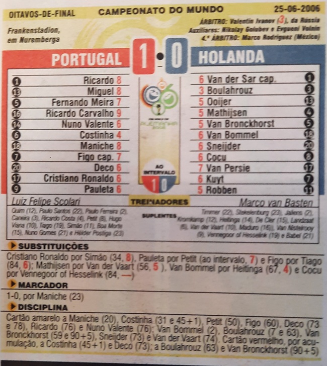 The duel against the Dutch was staged in Nuremberg on the 25 June, late at night. When the two sides prepared to come on to the pitch, they already knew England would be waiting for them in the last eight after beating Ecuador with a David Beckham goal. Ever the superstitious, Scolari was quick to point out to the players that, on route to the Euro 2004 final, Portugal had played the English before meeting the Dutch, and now it would be the other way around.