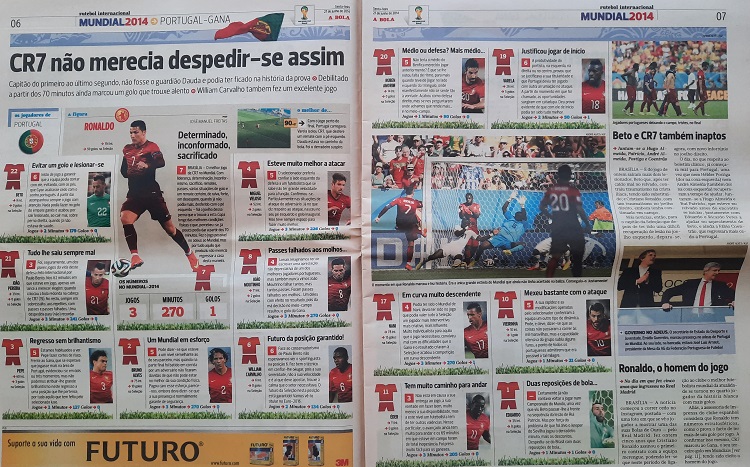 Three more goals were still needed, but hope was alive again. Ronaldo did his utmost, sending in four efforts on goal in the following minutes, all denied by the Ghanaian goalkeeper in style. Varela also missed a good opportunity and, come the 89th minute, Bento decided it was all decided and replaced Beto for Eduardo – after sending on Vieirinha and Varela for Pereira and Eder – to give the goalkeeper a chance to experience playing in a World Cup. It was as if he raised a white flag, a message that destroyed the players’ morale for a rampaging finish that never came.