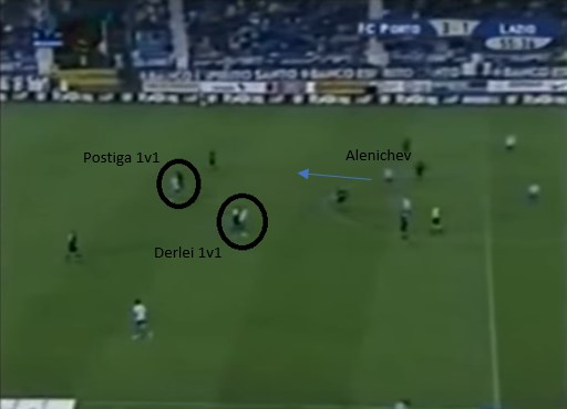 Vitor Baía hits a long goal-kick to the entrance of the final third. Derlei drops deep and drags his man who he beats to the header, while Postiga sits on the shoulder of his defender. Alenichev moves forward overloading the right side of a broken defence where him and Postiga would combine for the goal.