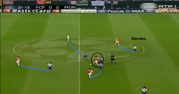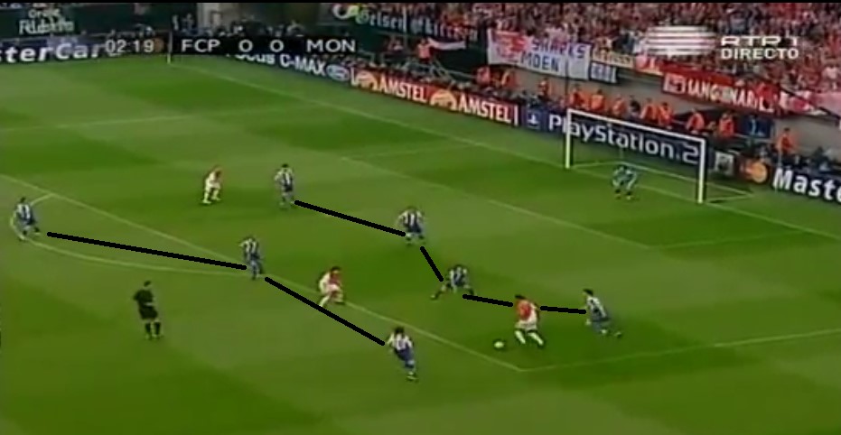 Here we observe Porto’s pressure even better. After a couple of aerial duels, as soon as Monaco get the ball on the floor, Costinha approaches his man while the rest of Porto’s players close all possible passing lanes. Monaco’s midfielder tries to get out of it by passing to the man closer to Pedro Mendes but the Portuguese midfielder recovers it and FCP transition into an attack.