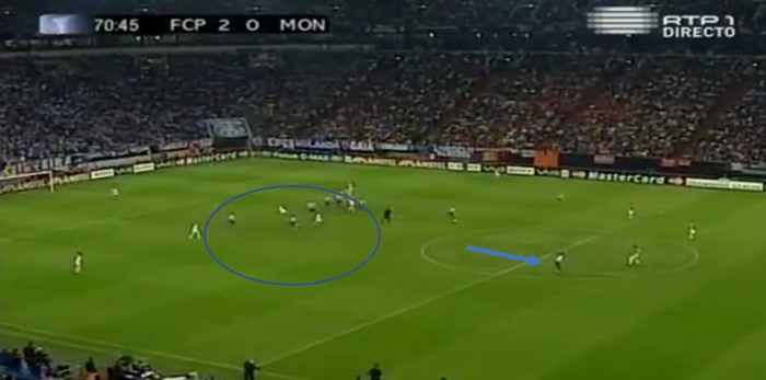 Here we see the best example of a Porto counter with the 2-0 v Monaco in the final. With Monaco pressuring after being down 1-0 halfway through the second half, we see Porto defending very narrow and with a lot of men pressuring the Monaco ball-carrier. As soon as FCP win it back, there’s a 3v3 with Deco leading the line with Derlei and Alenichev. Instead of passing it quickly, Deco overcame a defender first before doing so, therefore making it a deadly 3v2 that would end in his goal. A couple of minutes later a very similar play ended the match.