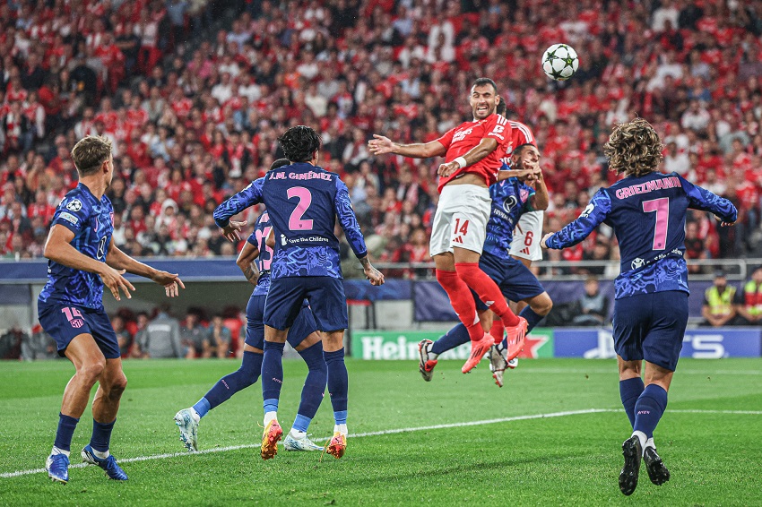 Benfica’s Vangelis Pavlidis battles for the ball in the air against Atletico Madrid. Photo: Arlindo Homem ©