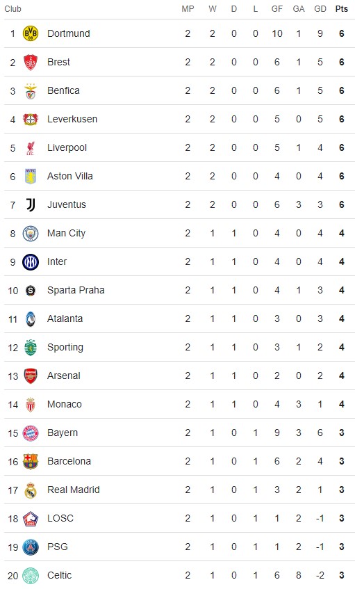 Top 20 teams in the Champions League table after two matchdays of the 2024/25 season