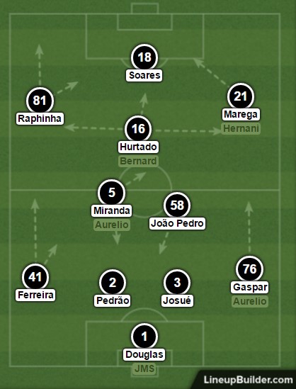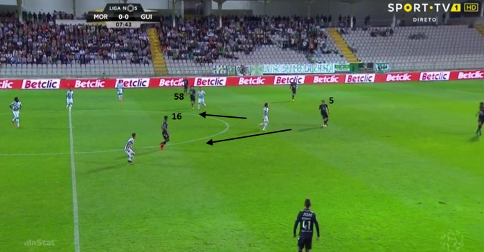 4) In this image we have a regular attacking movement by Martins’ men. As Bruno Gaspar progresses in possession, both wingers drift towards the inside of the box in the hope of overwhelming the opponent’s defence and marking system. Since both wingers moved inside, Hurtado stays around the box hoping to take advantage of a rebound. João Pedro stays on to cover of both the central space and the wing due to the full-backs’ movement; if it was Ferreira moving up on the left, Miranda would have this responsibility.