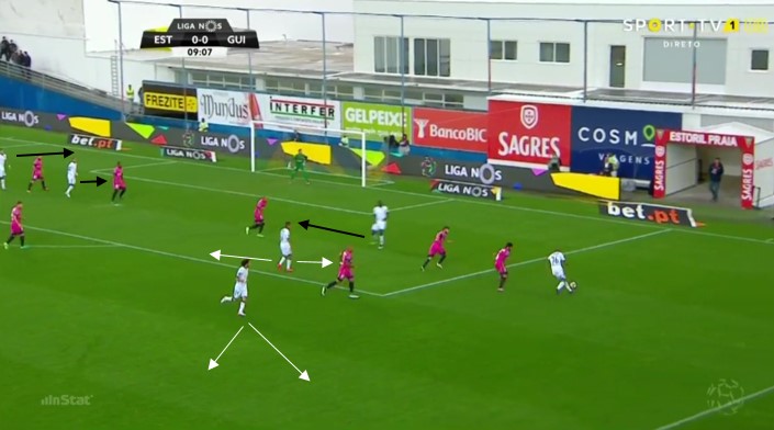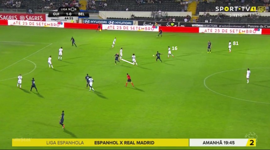 From midfield forward is where Martins’ ideas took longer to settle. The initial 4-4-2 was dropped to insert an attacking midfielder and increase fluidity between the three men behind the striker. Interestingly enough, neither of the two natural, and quite talented, attacking midfielders in the squad managed to grab a spot: Atleti’s loanee Bernard Mensah, who Vitória sold to the Spanish giants, and Tozé, ex-Porto who is in his 3rd season in the first division, have both been appearing mainly off the bench, with only one league start each.