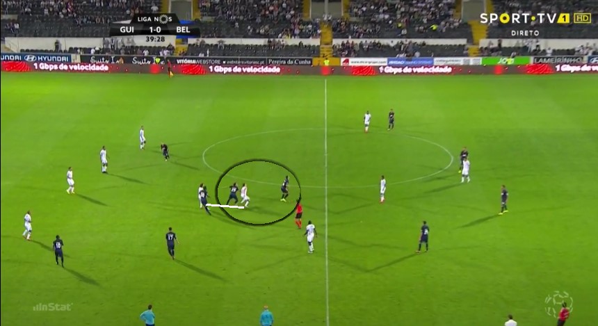1) Here we have the team somewhat organised defensively. The two central midfielders (CM) are always very close together, Marega closes on his full-back and on the other side there’s Raphinha missing. The talented winger still has a lot of work to do on the defensive part of his game and is leaving a gap here that could be exploited via a 2x1 for Belenenses.