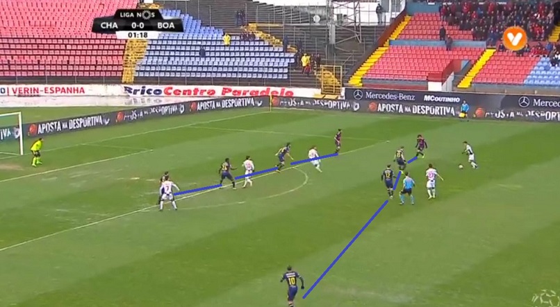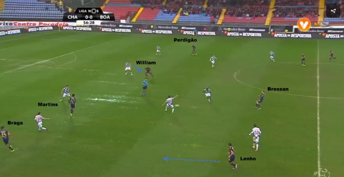 Here we see a couple of typical attacking movements from Chaves. William drops to try and receive the ball, Fabio Martins moves inside as Perdigão tries to give some width and Braga covers Martins’s space on the wing. With Bressan’s technical quality from midfield, the team gets access to the sort of passes you see in this frame – in between the opponents’ lines.