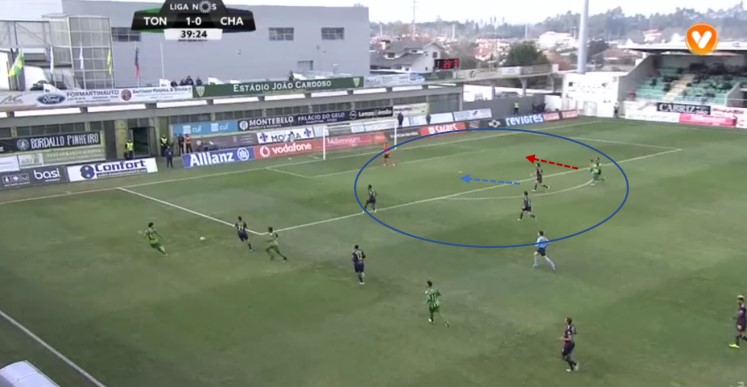 Chaves’ main defensive issues have come to light when defending set-pieces and crosses. In the indicated space there are four Chaves defenders for Tondela’s big man Heliardo – it’s worth pointing out that forwards with a big physical presence have been bugging them this year; Chaves are still the only side Depoitre has scored against. Here the Brazilian beats Lenho on the run and shows up on his own at the second post where the cross will fall. Nuno André Coelho in a midst of distraction and perhaps lack of coordination with his new teammates runs towards the first post where he doesn’t get the ball nor an opponent. Luckily for Chaves, Heliardo wins the header but doesn’t score.