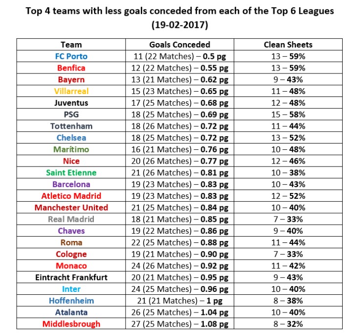 Defensively is where the team excels, though. The fourth best defence in the league, Chaves conceded 19 times in 22 matches and 40% of their matches ended with a clean sheet. Only top European sides can match such a record. To illustrate the fact, the table below lists the four teams that conceded the fewest goals to date this season in each of Europe’s top six leagues.