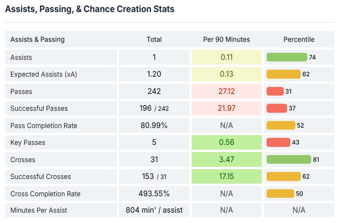 In terms of the defensive side of his game, it is not an area in which he excels. I think he lacks consistency in his actions because, although he is quite competent in 1-on-1 defensive situations (he has good timing when tackling most of the time) and even has moments when, for example, he presses the opponent in the first phase of build-up play, he does not always do so consistently. Also, in the defensive transition phase, there are moments when he gives up on the play, leaving his teammates in a difficult situation.
