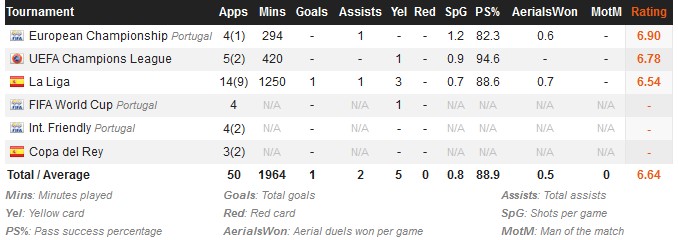 The lack of confidence in Gomes’ game this season has been detrimental, and this is shown when comparing his statistics with Barcelona and Portugal. His passing accuracy appears to be impressive for Barcelona (94.6%). However, in actual fact, it’s only so high due to the lack of adventure and confidence in his passing when wearing the Barça shirt. In contrast, his passing accuracy for Portugal reads in at 82.3%, along with 1.6 key passes per game, which displays how differently he approaches games for club and country.