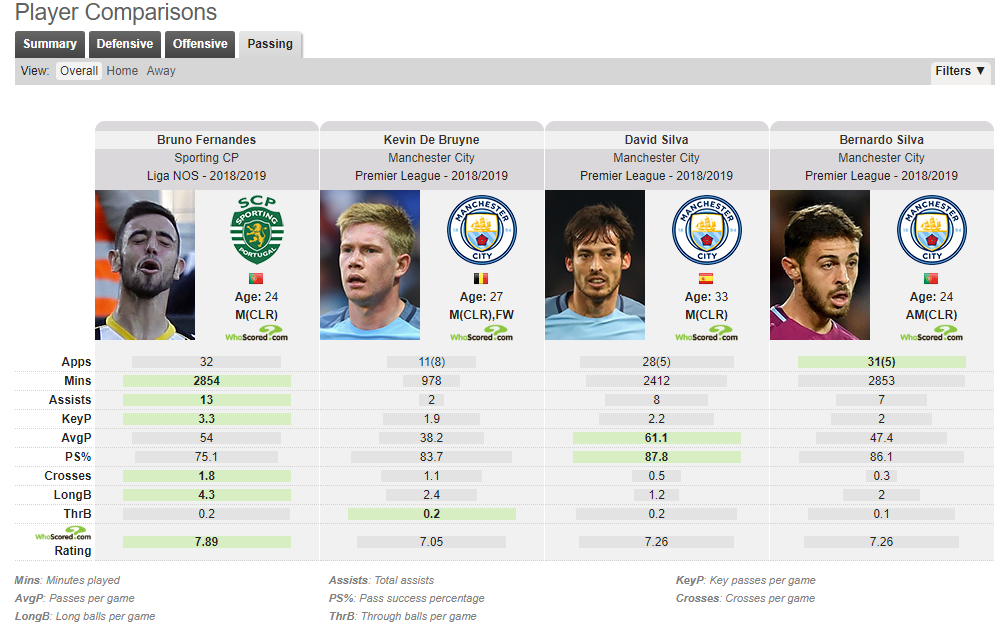 This season, Bruno delivered almost twice as many long-balls as Kevin de Bruyne, probably the most direct of City's current midfielders. Bruno also has a fairly mediocre pass completion percentage for a midfielder, a point exaggerated when comparisons are drawn with City’s current midfield stock (see graphic). He’s more reckless than City’s midfielders too, losing the ball more often and obviously shooting more. In Portugal, Bruno’s electrifying goals regularly buoyed Sporting, but Premier League defenses might not be so accommodating. Against Arsenal in the Europa League this season, Bruno was fairly pedestrian, completing 73% of his passes, including four key passes, and tallying a 6.4 rating across two matches against the London-based club who will square off against Chelsea in the final.