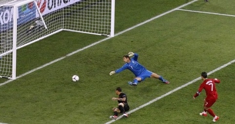A friendly in Lisbon against reigning World and European champions Spain just a couple of months after Bento’s appointment spoke volumes about the change in mentality in the squad – and Ronaldo. A vibrant, joyful, energetic performance saw the hosts thwack their Iberian neighbours 4-0, and it could have been more if Ronaldo’s greatest ever goal that never was had stood. Picking up the ball in the inside left channel, Ronaldo drove into the box at speed, twisting and turning and leaving a tangled Gerard Piqué sliding on his back side, before producing a ridiculously perfect angled lob over Iker Casillas with the outside of his foot from a standing position just a few yards in front of his club colleague. Unfortunately, Nani running in at the far post got a touch as the ball was bouncing into the net and was ruled offside, and an authentic work of art was invalidated.