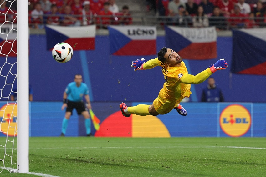 Oops, that wasn't in the plan. Lukas Provod's terrific finish is out of reach of the diving Diogo Costa and Czechia take the lead