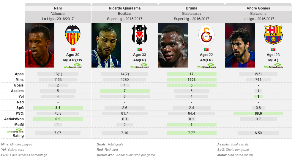 Meanwhile, Nani is an ideal late game sub, but for André Silva rather than in midfield. Although he plays on the wing for Valencia, his metrics don’t compare well to Portugal’s other midfield options. It’s a luxury that we have better dribblers, crossers, and goalscorers than Nani in midfield these days. We do lose some aerial threat with Nani, but he has relatively good instincts for finding space behind the back four. He and Eder should share the responsibilities of augmenting Portugal’s No.9 position.