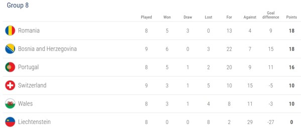 The playoff route is still an option if Romania top the group. Portugal can go above Bosnia-Herzegovina and claim second spot in Group 8 with two wins, but there are second placed teams in other groups with more points on the board.